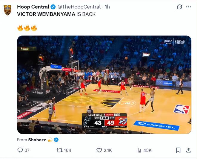 北京时间12月14日,圣安东尼奥马刺队迎来了维克托-文班亚马的复出,他自11月17日后伤停至今已经过去了27天之久,也因为他的伤情此役他有登场时间限制,上半场仅打7分,全场比赛也只打了21分钟不到(20分39秒),可他无比强大的比赛影响力帮助马刺爆冷击败了联盟第一的雷霆,OKC吞下赛季第二场失利。